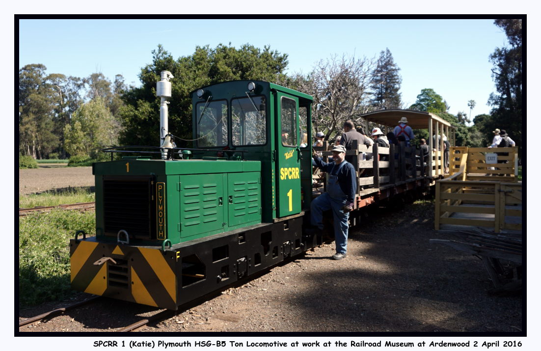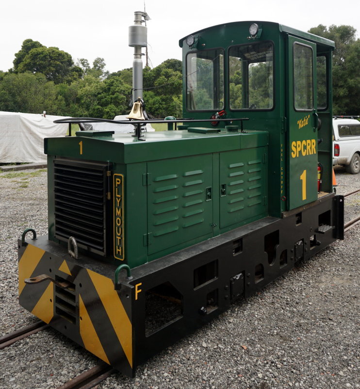 A 5 ton Plymouth gasoline powered locomotive with a hydraulic transmission. It is a modern industrial locomotive used for operations, switching, and maintenance of way. This engine was purchased by the SPCRR in August 2004 after leasing it for several years from a member.